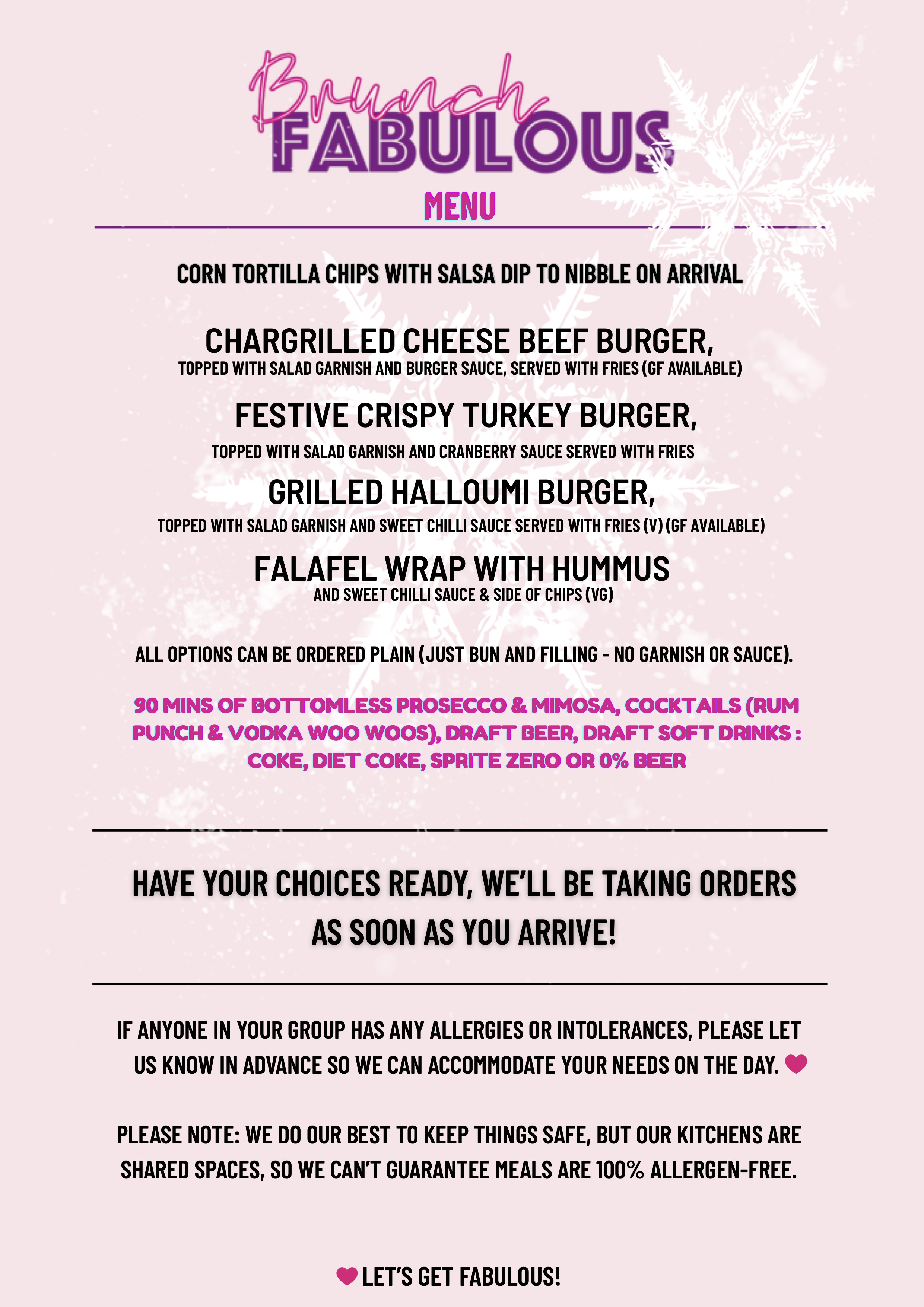 Your choice of Festive burger & side of chips (see menu below, no pre order required! We will take your order on arrival)
